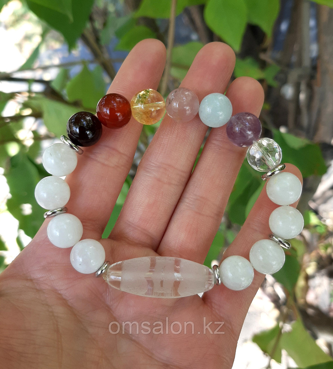 Браслет с минералами по 7 чакрам и Бусиной Дзи Гаруда. Минералы: гранат, сердолик, цитрин, розовый кварц, аквамарин, аметист, горный хрусталь, адуляр.