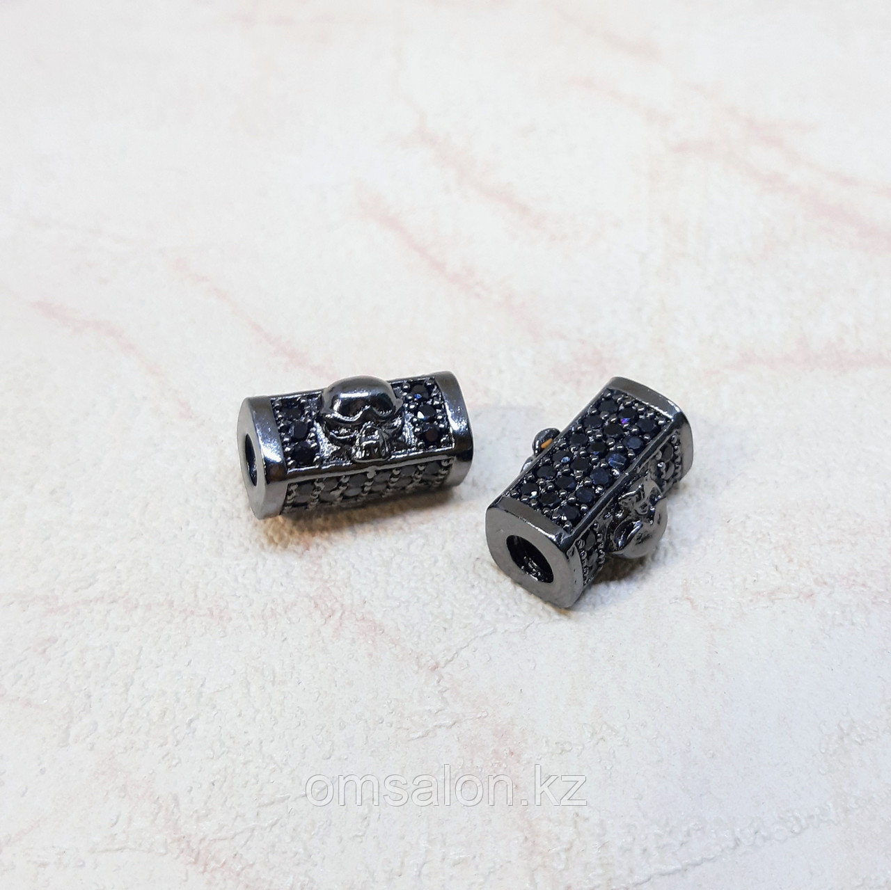 Бусина Трубочка с изображением черепа, с фианитами, 14х7х7мм. Отверстие: 3мм. Материал ювелирный сплав с родиевым покрытием, фианиты. Цвет: черный. Цена за 1 шт.