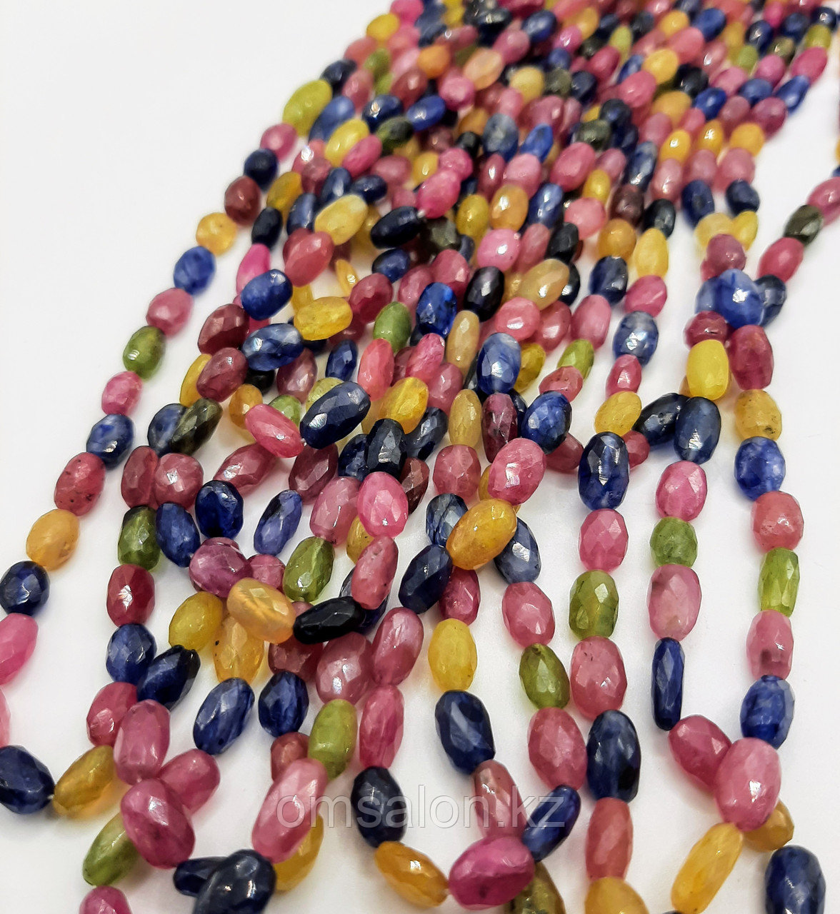 Рубин, синий, зеленый и жёлтый сапфиры, граненые. Размер 8×5мм. Длина нити 42см