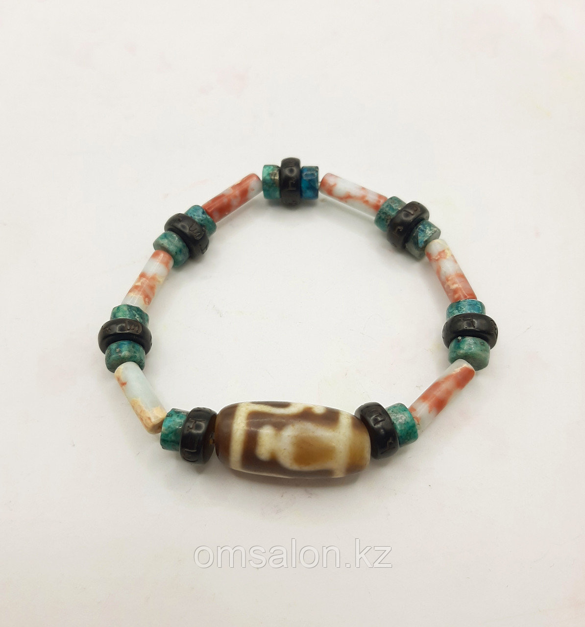 Браслет из змеиной яшмы со вставками из африканской бирюзы, эбенового дерева с мантрой Ом Мани Падме Хум и бусины дзи Нектарный Сосуд.