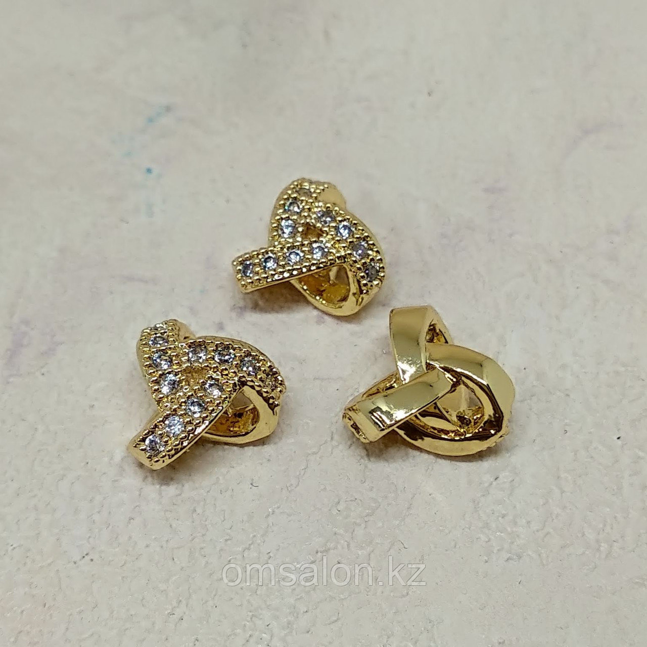 Бусина с фианитами, может быть использована в качестве бэйла. Размер 10х10х5мм. Отверстие: 3мм. Материал: ювелирный сплав с родиевым покрытием. Цвет: золото. Цена за 1 шт.