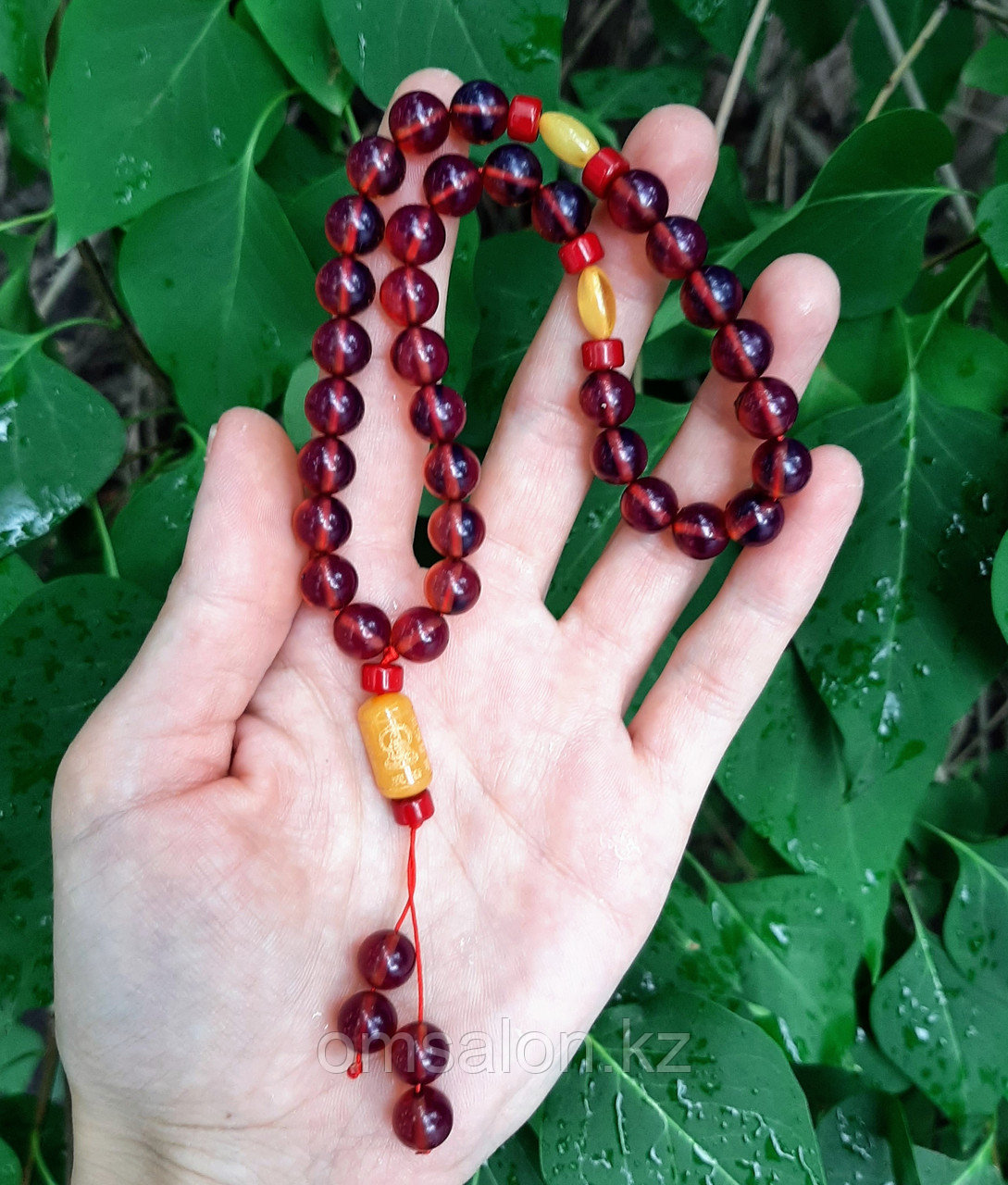 Чётки из янтаря с бусиной Гуань Инь. Диаметр бусин 8мм. Количество бусин: 33, разделители через 11. Материал: янтарь, коралл.